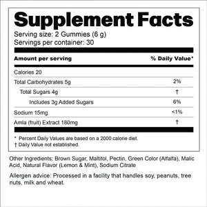 • Lower in calories: At only 20 calories per serving, our Amla gummies offer a guilt-free, low-calorie treat that fits seamlessly into any health-conscious diet.