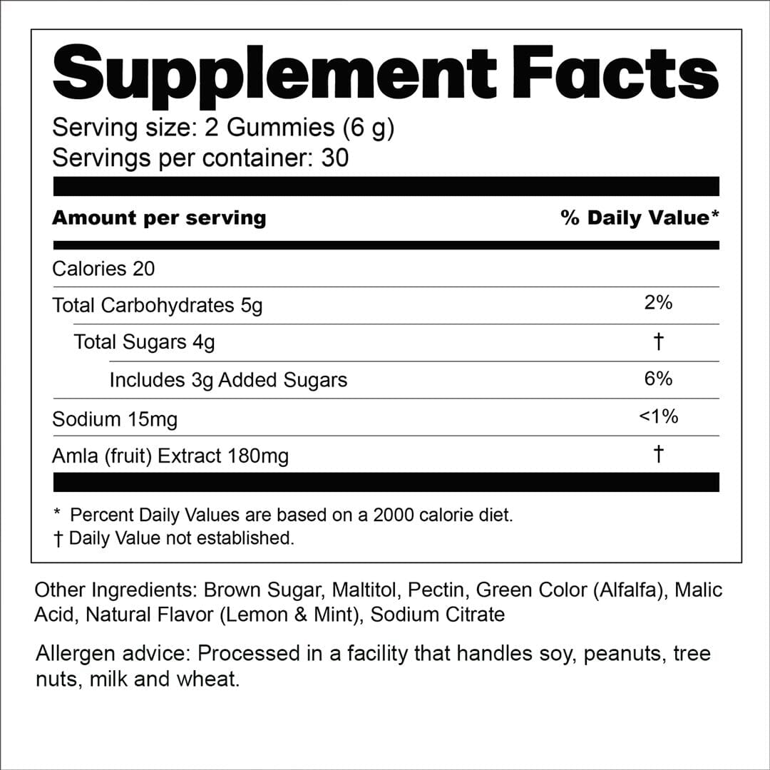 Amla (Indian Gooseberry extract), Pectin, Brown Sugar, Maltitol, Malic Acid, Sodium Citrate, Natural Flavor (Lemon & Mint), Green Color (Alfalfa).