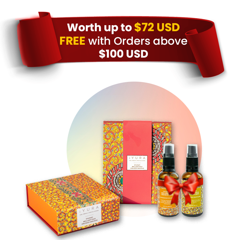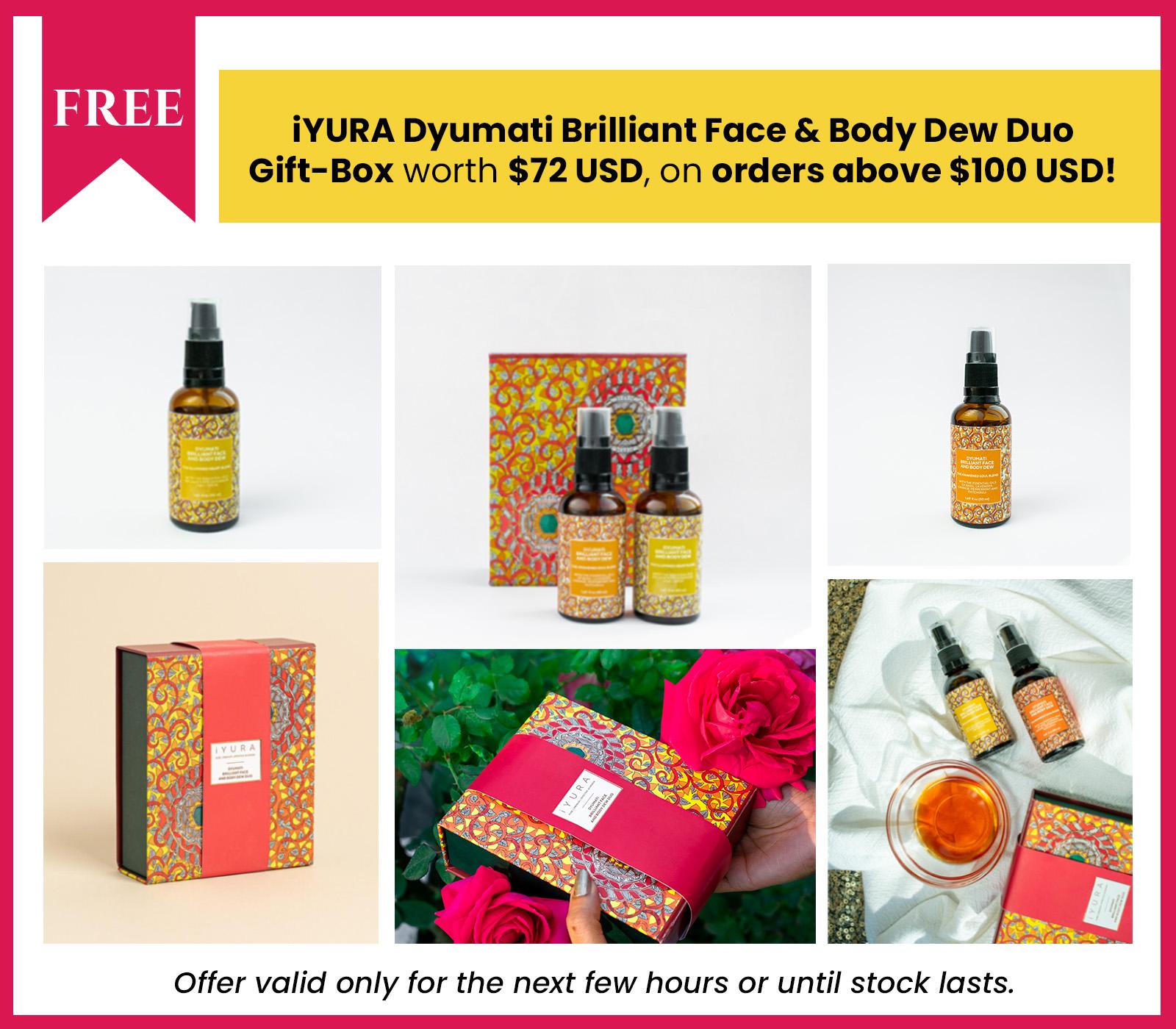 iYURA's magificent - Dyumati Brilliant Face and Body Dew Duo, worth $72 USD, but during this exclusive Early Black Friday Sale, you can get this favorite gift-duo for FREE with orders above $100 USD! Once you add $100 worth of products to your cart, this gift will automatically be added to your cart!