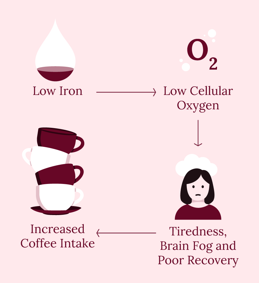 Low iron → low cellular oxygen → tiredness, brain fog and poor recovery. Boosting iron status (or improving iron absorption) reduces fatigue in people.