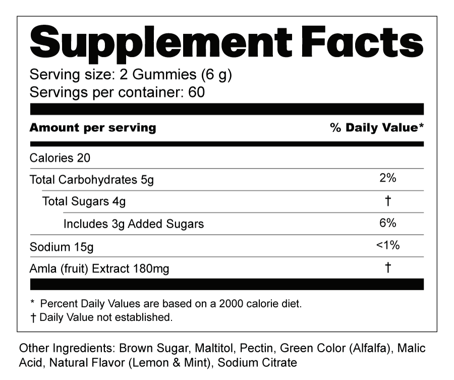 Amla Berry extract is the active ingredient in Amla Gummies.