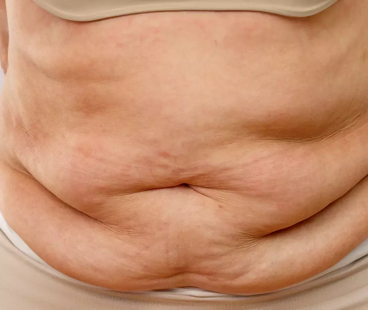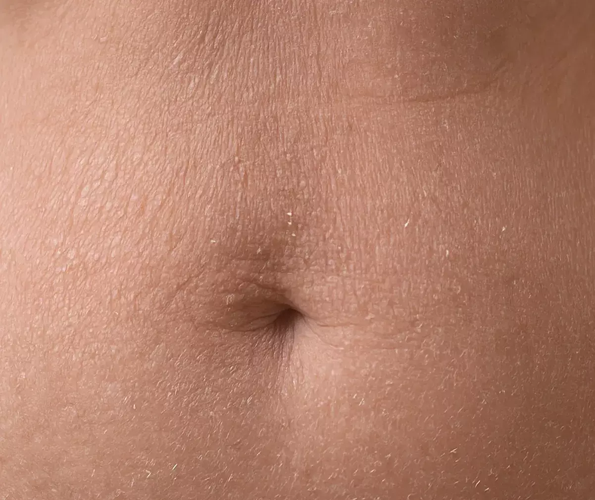 The fold creates a humid, low-airflow environment, yet paradoxically, the skin may feel dry, or dehydrated. The skin on the belly can thus look more fragile, dull, or rough.