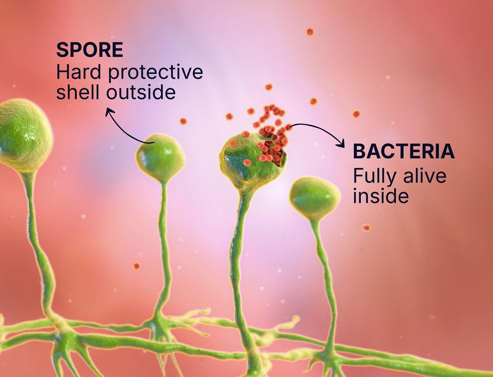 They naturally wrap themselves in a hard protective shell, called a spore, that acts like armor. This shell keeps the bacteria dormant and safe through heat, stomach acid, humidity, and digestion.