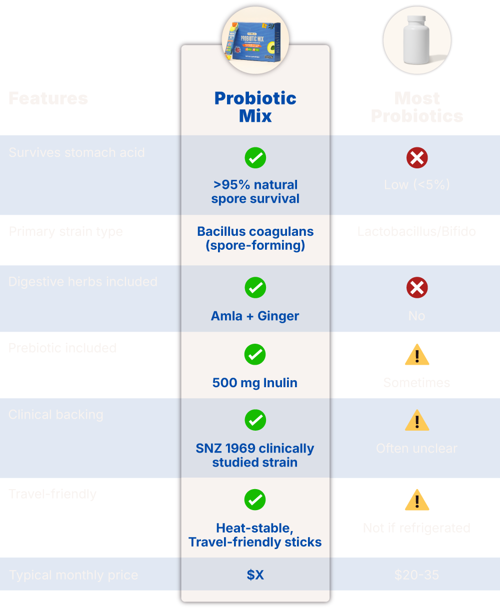 Unlike regular probiotics that need special coatings or refrigeration, spore-forming probiotics naturally protect themselves with a tough outer shell — no synthetic coating required. This spore structure keeps the bacteria dormant and stable until it reaches the lower intestine, where it safely activates and starts supporting digestion.