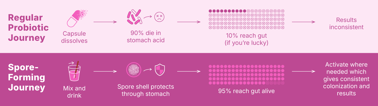 In short, spore-forming probiotics are built to last and to work exactly where your gut needs them most.