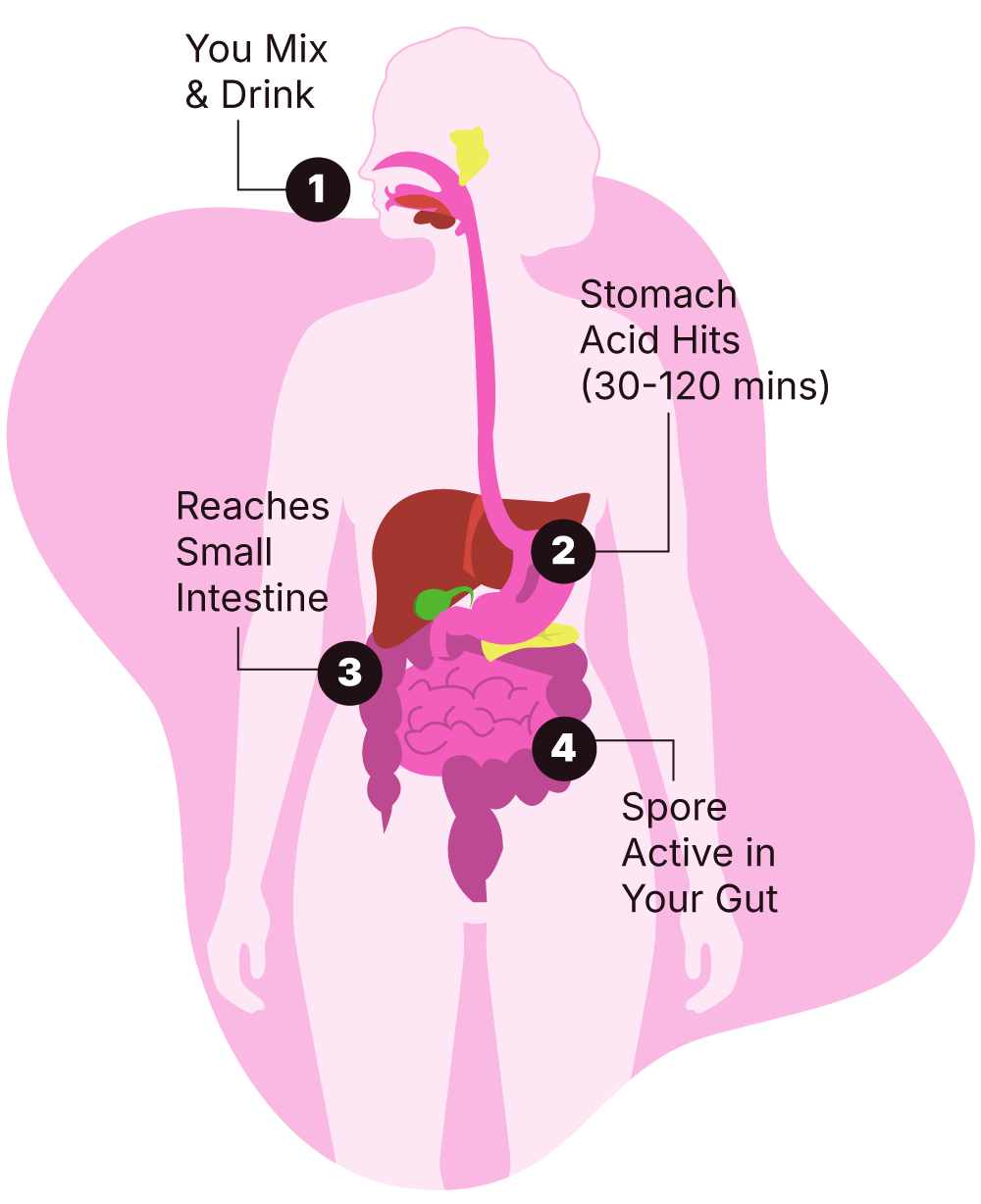 Once the spore reaches the intestines — where conditions are right — the shell opens, and the probiotic becomes active exactly where it’s meant to work.