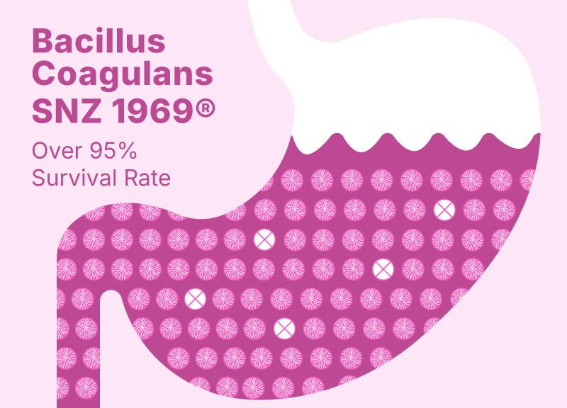 Most probiotics don’t survive your stomach acid — they never stand a chance. But spore-forming strain— Bacillus coagulans SNZ 1969® — has over 95% survival rate, comes protected with a natural “shell” that acid can’t break through.