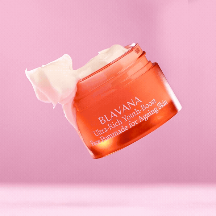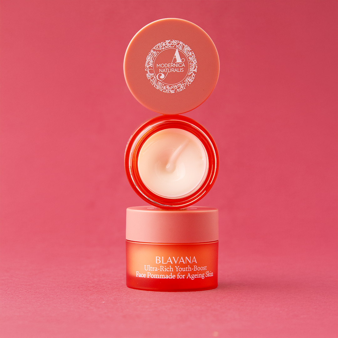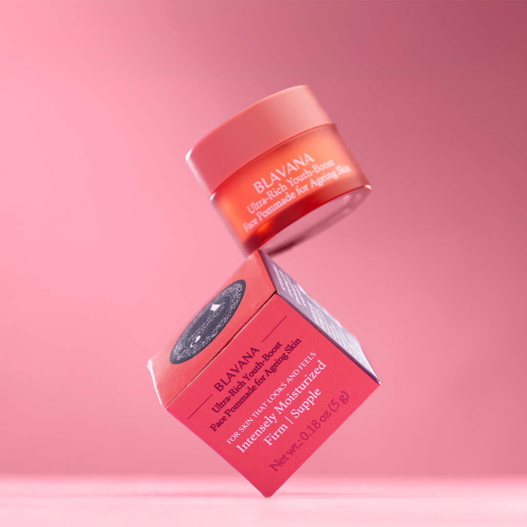 Take a pea-sized amount of the luxurious Blavana Youth-Boost Face Pommade.