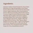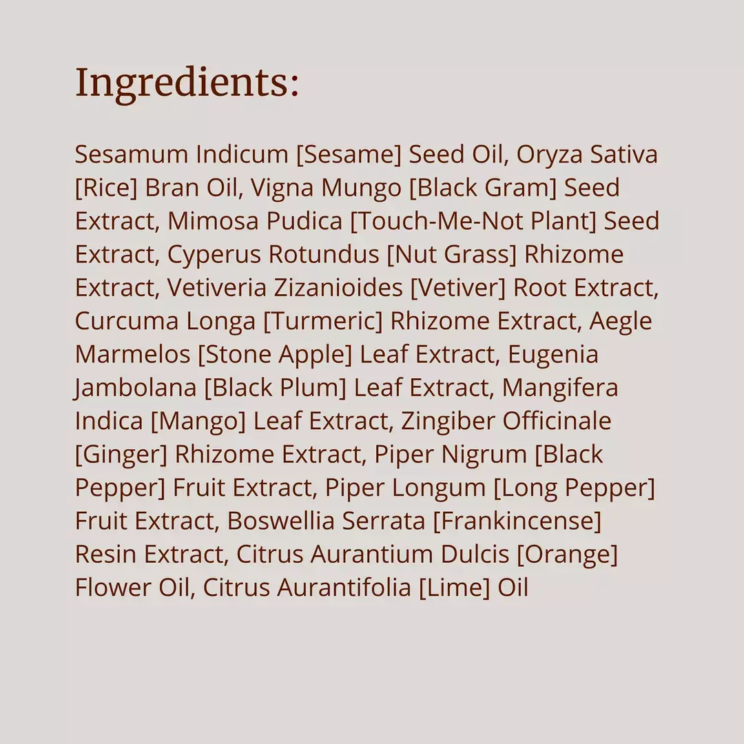 Sesamum Indicum (Sesame) Seed Oil, Oryza Sativa (Rice) Bran Oil, Vigna Mungo (Black Gram) Seed Extract, Mimosa Pudica (Touch-Me-Not Plant) Seed Extract, Cyperus Rotundus (Nut Grass) Rhizome Extract, Vetiveria Zizanioides (Vetiver) Root Extract, Curcuma Longa (Turmeric) Rhizome Extract, Aegle Marmelos (Stone Apple) Leaf Extract, Eugenia Jambolana (Black Plum) Leaf Extract, Mangifera Indica (Mango) Leaf Extract, Zingiber Officinale (Ginger) Rhizome Extract, Piper Nigrum (Black Pepper) Fruit Extract, Piper Longum (Long Pepper) Fruit Extract, Boswellia Serrata (Frankincense) Oil, Citrus Aurantium Dulcis (Orange) Flower Oil, Citrus Aurantifolia (Lime) Oil.