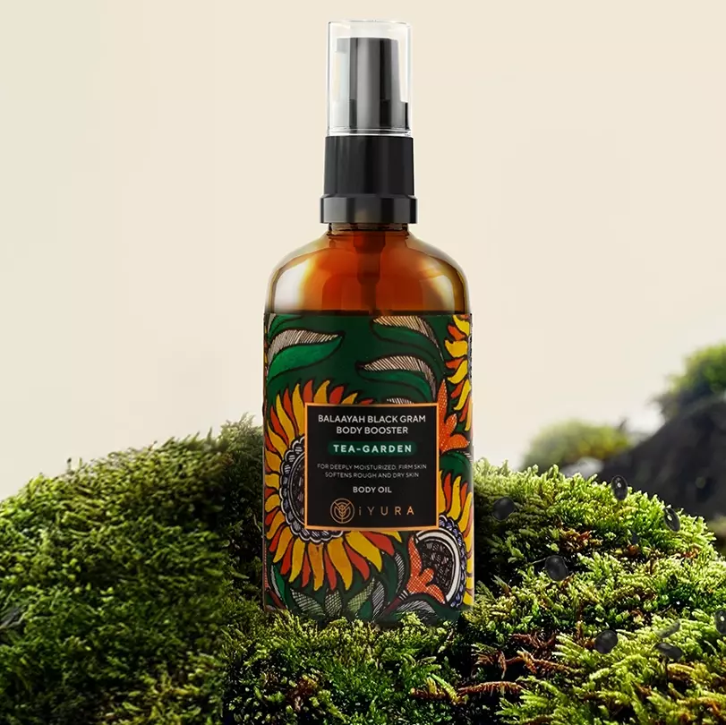 Balaayah Black Gram Body Booster Tea-Garden —a velvety-feel inducing abhyanga oil designed for use on the whole body, including arms, thighs, hips, legs, back, chest but also – the often forgotten, midsection and fold-prone areas including your abdomen, flanks, and the skin below the overhang.